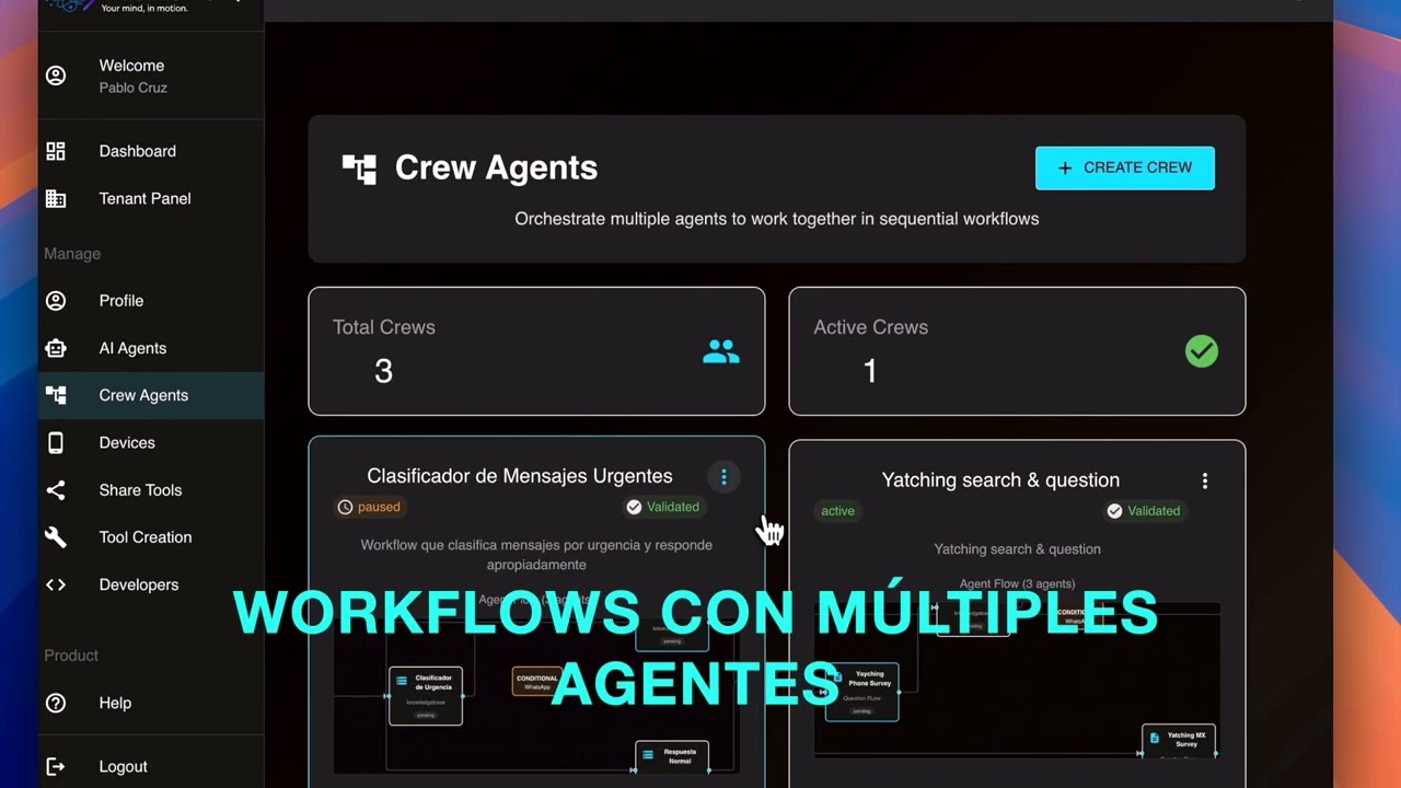 Design AI agents, complex workflows, internal tools, and launch entire SaaS products. Integrate with WhatsApp, your App or custom endpoints - completely white-labeled. No code required.